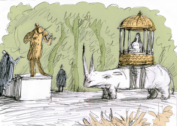 Tandis que les jets d’eau des fontaines romantiques s’élançaient dans l’air d’automne, l’automate – violoniste relégué depuis des lustres au fond du parc fut remis en marche, l’orgue à eau joua un viril « Sambre et Meuse » puis un divertissement aigrelet et charmant qui pouvait évoquer la quatrième Barcarolle de Fauré, surtout vers la fin…